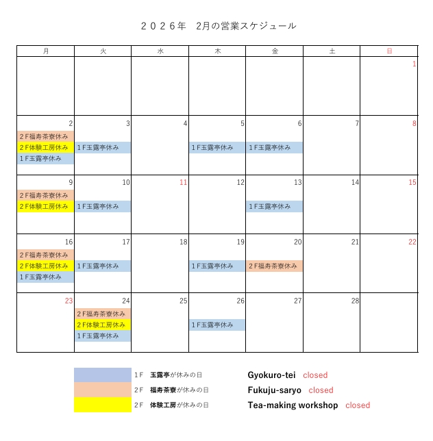2月の休業日と営業時間について Calendar of holidays in February